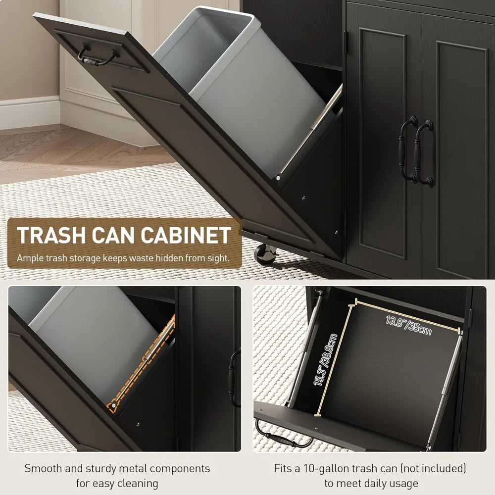 - Tilting trash cabinet hides a 10-gallon can for discreet waste and fresher air at the prep station.